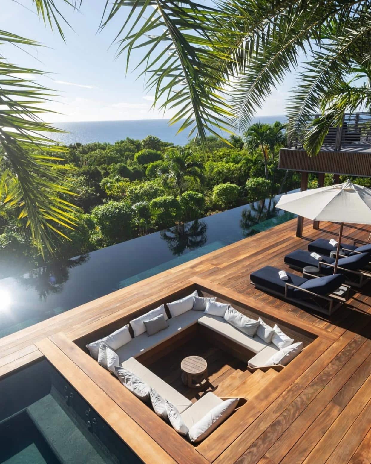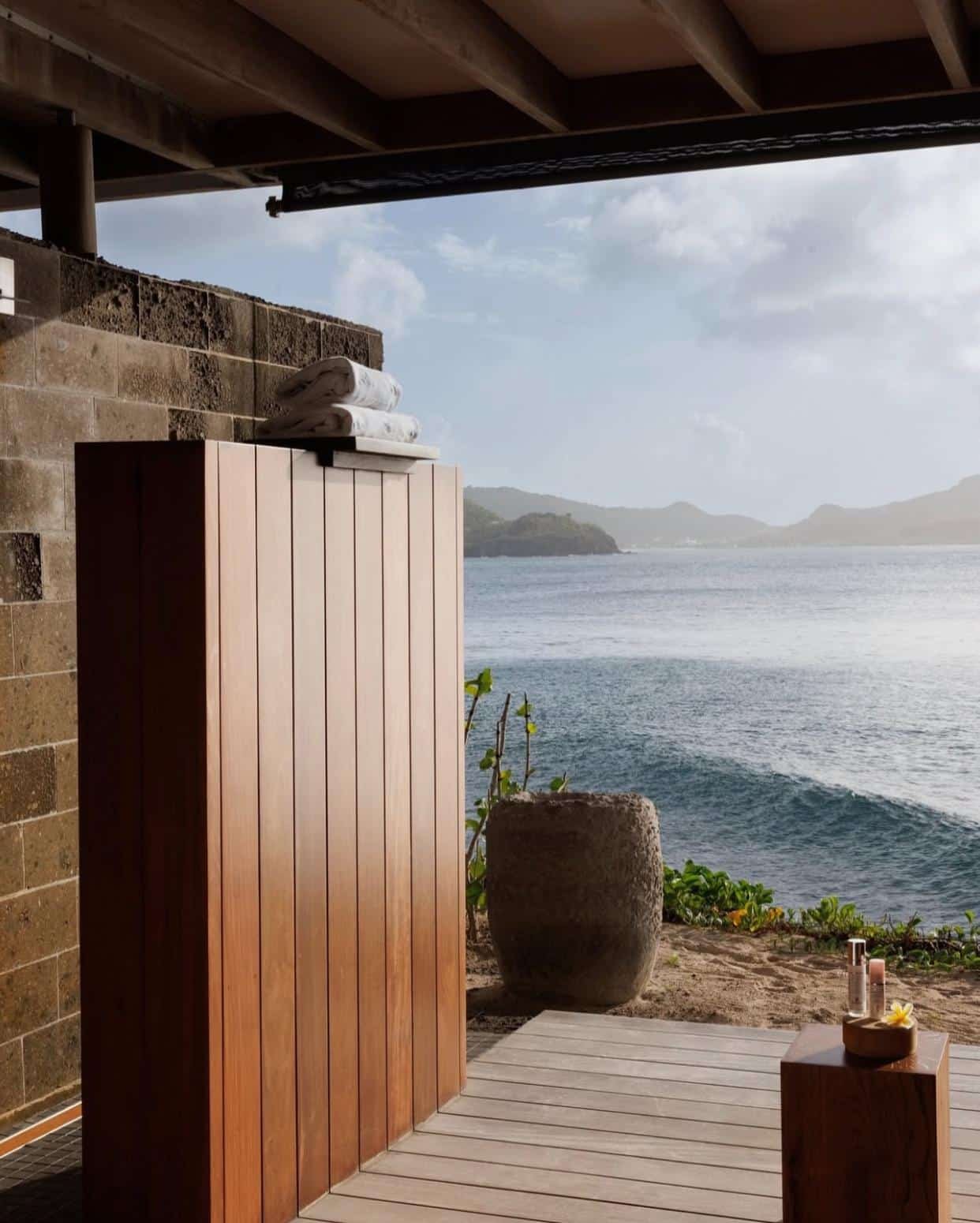 Bois exotiques, pierre locale, lumière naturelle et artisanat caribéen créent des atmosphères apaisantes.