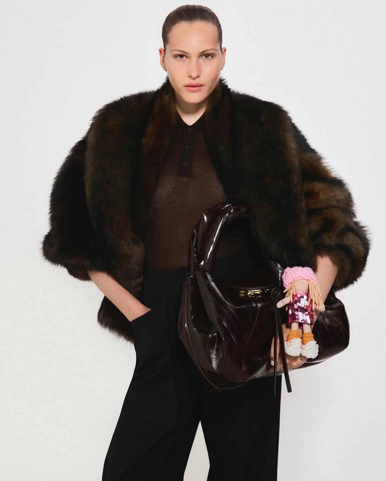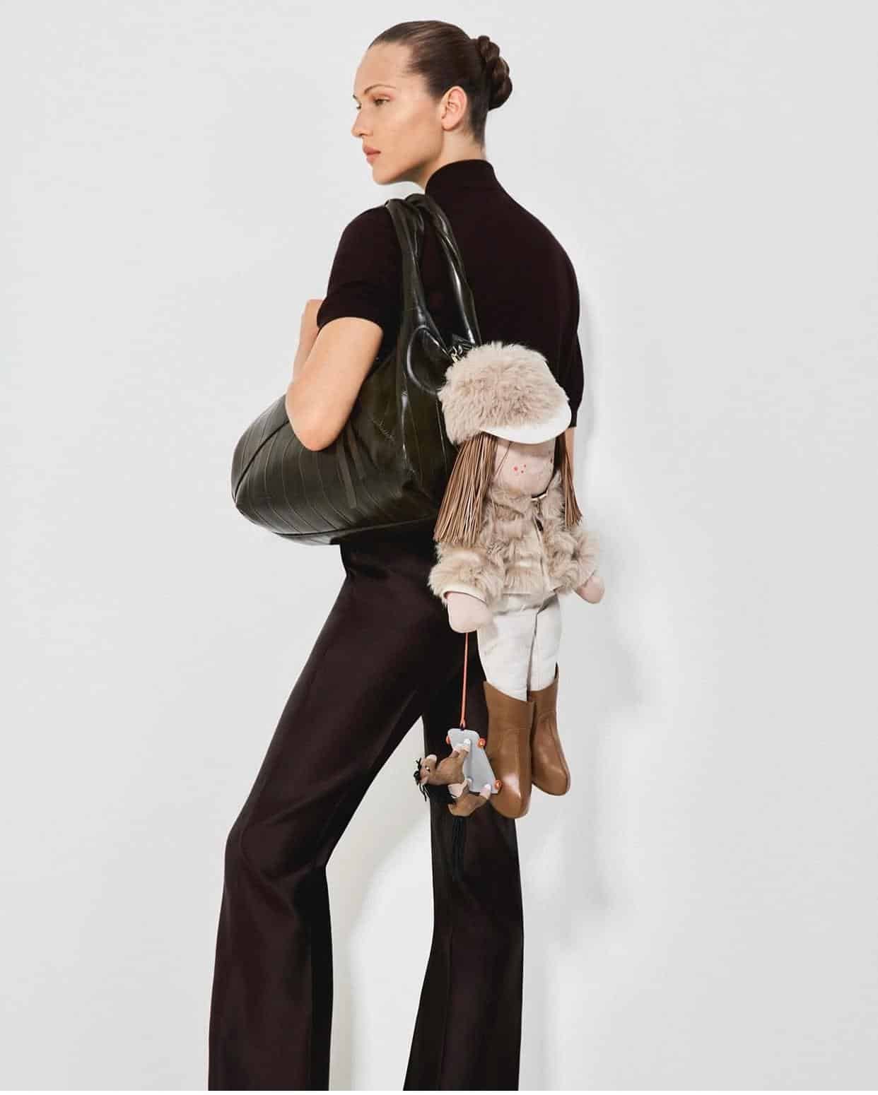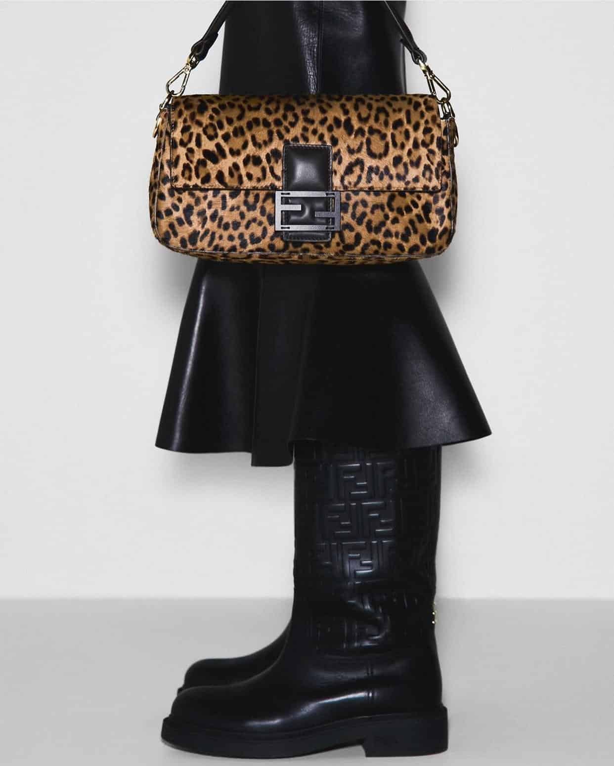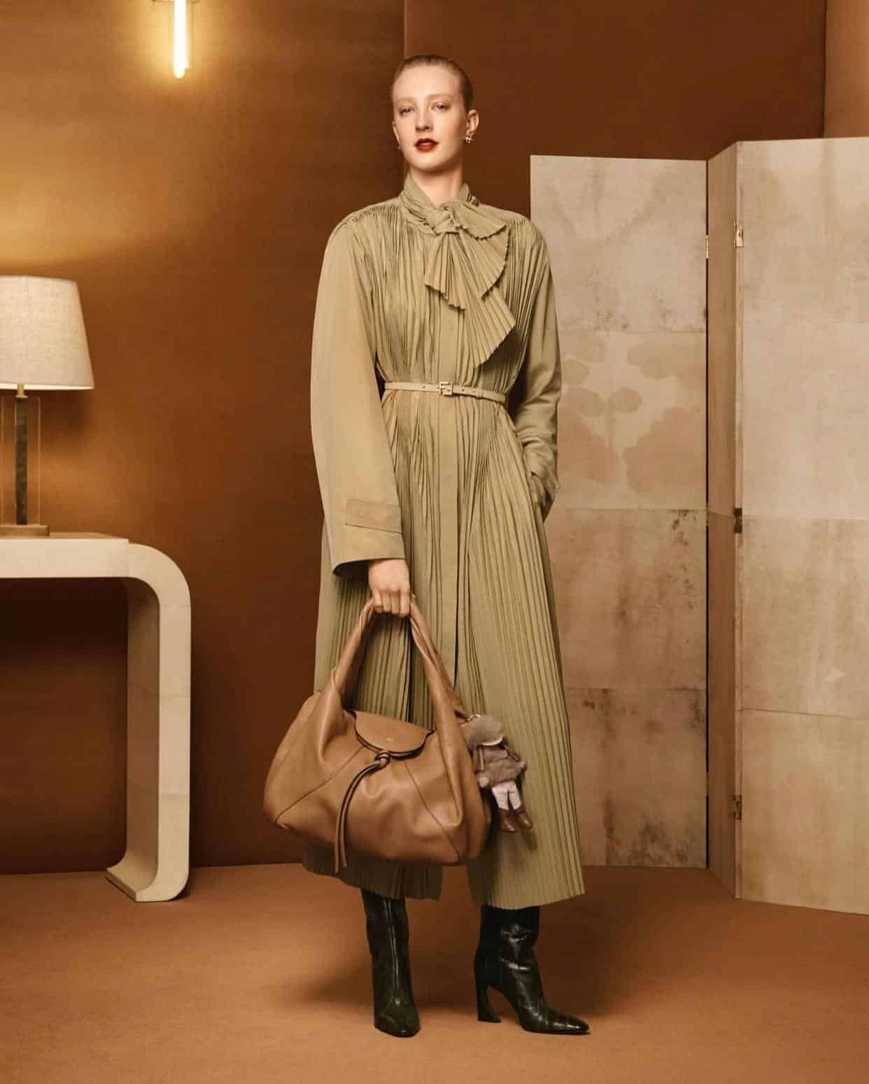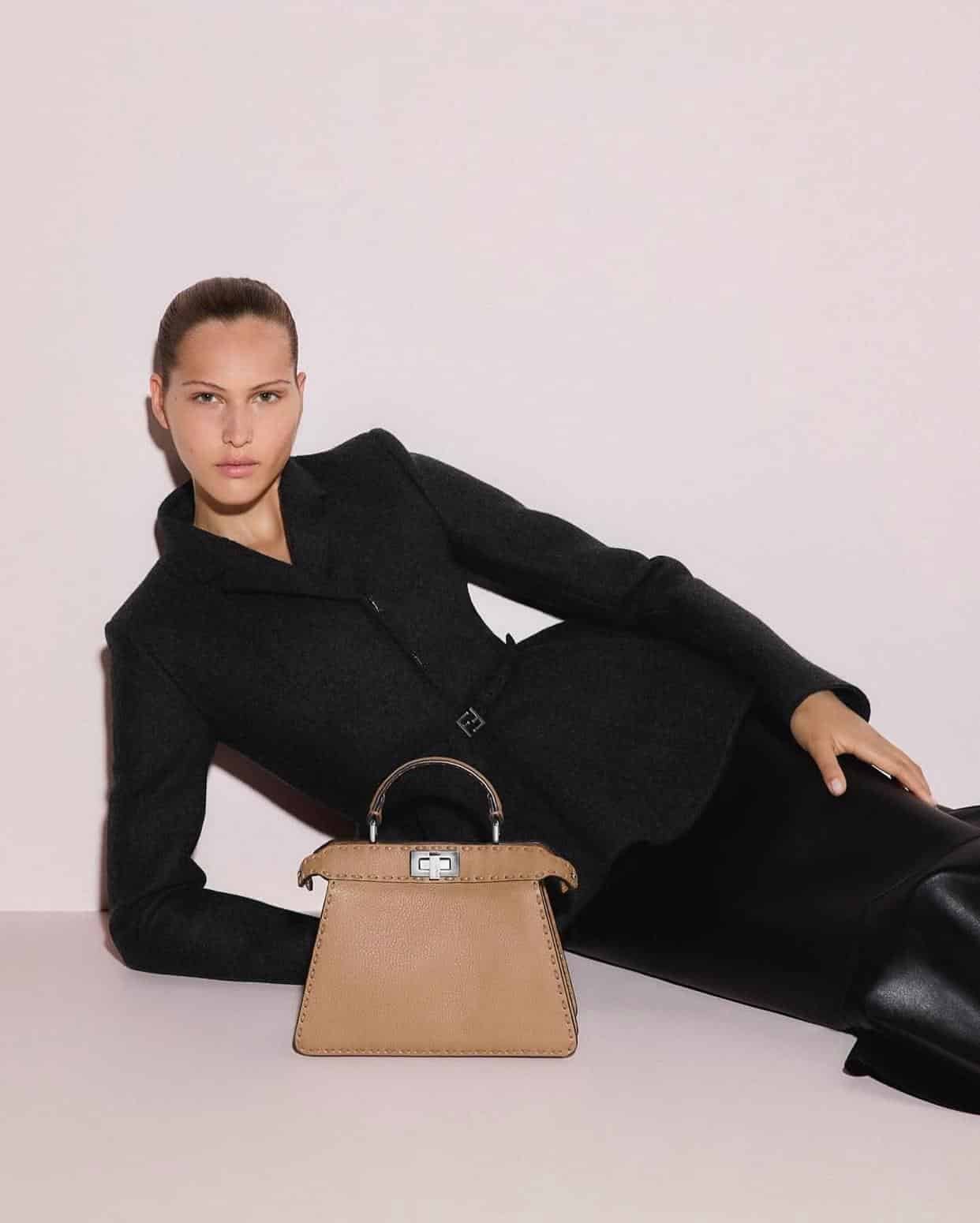 Les accessoires iconiques — Peekaboo, Baguette, Fendigraphy — s’intègrent naturellement à ce vestiaire d’hiver, dans des teintes naturelles et des cuirs responsables.