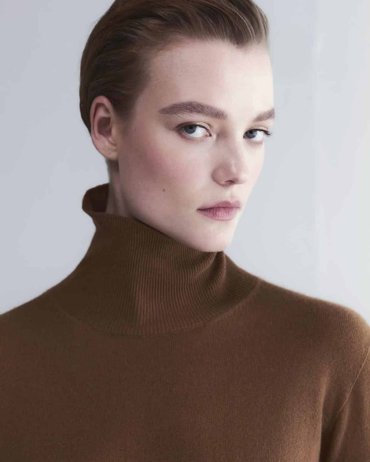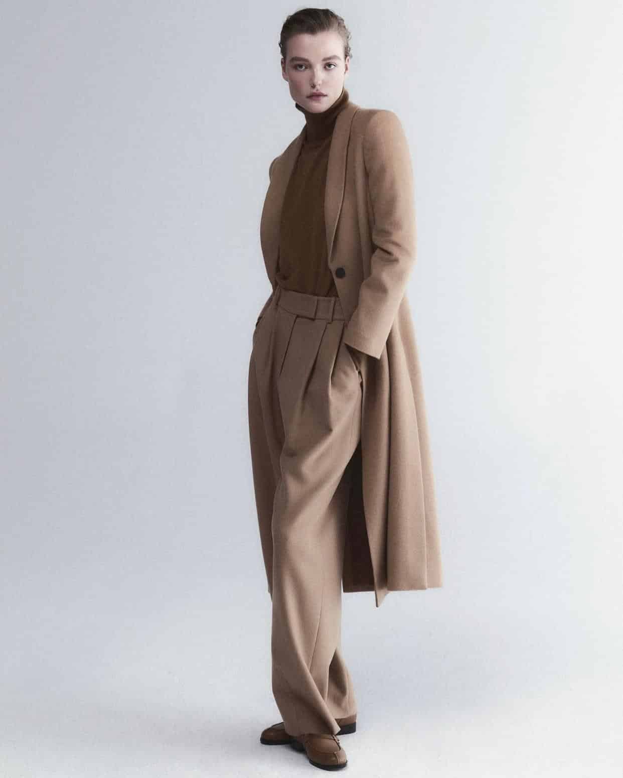 Les silhouettes, à la fois souples et architecturées, sont conçues pour s’adapter au rythme de la montagne : manteaux en cachemire technique, vestes en drap de laine, pantalons fluides et mailles enveloppantes.